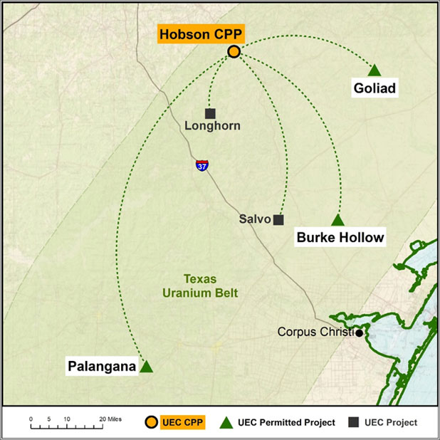 - Hobson Central Processing Plant (CPP) is the Hub to five satellite In-Situ Recovery (ISR) project areas (Spokes) across the Texas Uranium Belt, including three fully permitted projects and the newest and largest ISR wellfield being developed in the U.S. (the Burke Hollow Project).